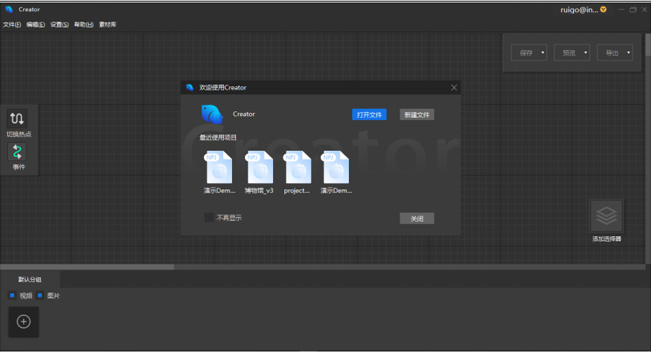 (2)登陆编辑系统后进入欢迎界面,点击新建工程或打开最近保存的工程文件就可以正式进入Creator,发挥你的创造力和想象力,绘制你的虚拟新闻世界。