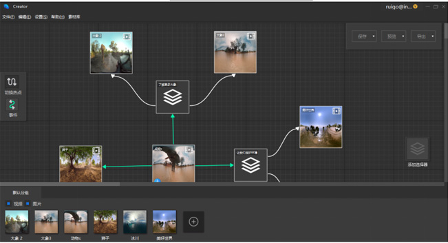 Creator是一个面向非技术人员的VR内容制作工具,支持全景图片及全景视频的交互编辑,它能够帮助用户通过场景串联跳转、加入相应的响应事件,进而能够快速完成一个VR演示内容的制作。
